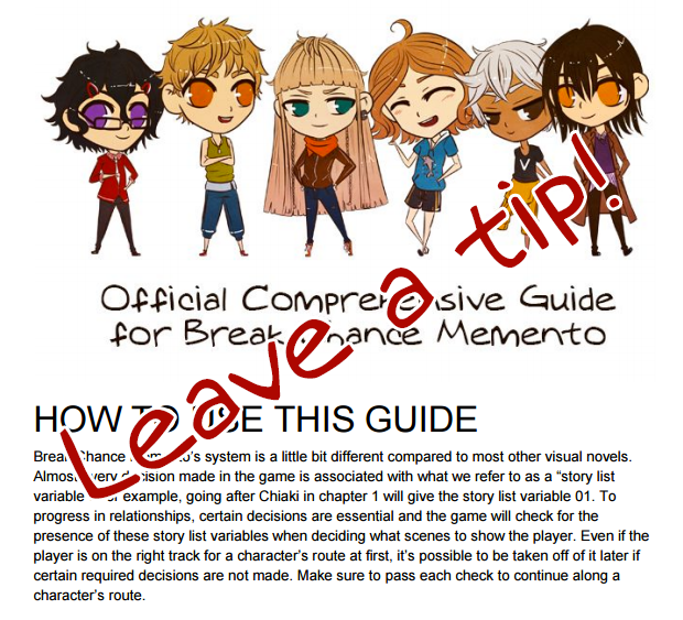 A comprehensive guide for Break Chance Memento is available free to anyone who purchases the game. However, if you'd like to leave a tip, you may do so here. Thank you for your support and interest in the game!